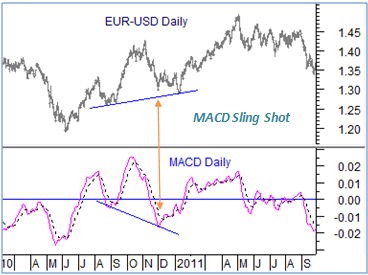 Moving average Convergence and divergence is one of the few indicators which gives reliable signals, but not to get carried away with the fact, the capability of the price trend to move matters more than mere finding of a signal. In one such instance the MACD Bullish sling shot can be an intermediate signal. The frequency of occurance is less, but when used as n intermediate signal.