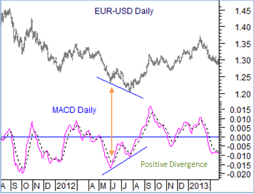 MACD Divergence: The frequency of price divergence with MACD can occur multiple times in a month/quarter but the period of divergence can provide valuable clues of potentials of the trend to unfold. In the chart below the positive divergence of the MACD to price has caused a reversal of the trend to make a new swing high.