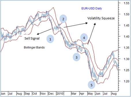 To decipher the chart above the following points may be worth noting: The sell signal that we saw after price reversed its rally and tested the lower end of the bollinger band could be considered as a first phase of weakness. In between we have had occasional phases of narrow bands which can be treated as a volatility squeeze. That is a period of lower volatility was followed by a period of higher volatility. Finally the impulse wave marked as 1 to 5 indicates a pattern in which a trend matures before making a reversal. Here the weakness in EUR-USD from 1.50 cents to 1.20 cents followed a impulse wave down, where the price trend after falling to 1.20 cents had seen a characteristics of an impulse wave down or in other words the weakness from 1.50 could be maturing close to 1.20. Hence the sell signals if seen any at this phase of the trend is to be taken like "a pinch of salt". As the basic limitations of technical signals is that we do get some signal or the other at the market top and bottoms. Hence after an extended move, looking for an impulse wave up/down can help discriminate going long at tops or going short at bottoms.